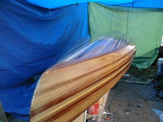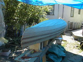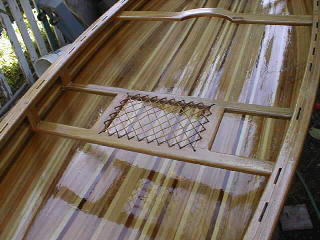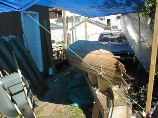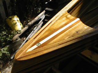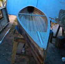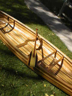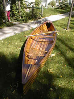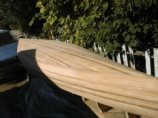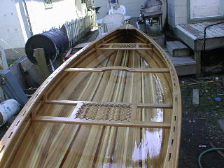 Andrew's Cedar Strip CanoeWelcome to another of my projects, My first big woodworking project was a Rolltop desk made in 1988 since then my project have been on a smaller scale till I built my office desk January 2000 for my new job. I've been dreaming about building a canoe since the mid eighties when I moved from home and decided that fishing from a boat would be more enjoyable than sitting on the shore. So I set out to find a boat I quickly decided that a canoe was the way to go but what kind? I found that fiberglass and aluminum canoes were too heavy for one person to carry so I decided on a cedar strip one problem the cost of buying one was around $2500 so I thought why not build one? Well 12 years later I received my new Spring 2000 Lee valley catalogue in the mail and saw that they had canoe plans for sale. I then decided that enough was enough and that it was finally time to make my dream a reality. I set out to build the strong back in early June 2000. That was fairly simple then it was time to book a week's holiday and get the lumber. I drove down to my local Lumber yard and discovered that 16' lengths of lumber are not readily available so it was off to Windsor Plywood here in Winnipeg that I found the lumber I needed. I decided that by looking at the different strip canoes that I wanted some variation in the wood so I decided on western red cedar, pine, redwood and mahogany. to rip the 1" x 6" boards to 1"x 1/4" strips then I had to run them through the router to put a bead and cove on the edges. That done it was time to assemble the hull. Of the two ways to assemble it I chose to start with the bottom and work my way to the top unfortunately, I was so wrapped up in building it I forgot to take pictures until the hull was almost complete